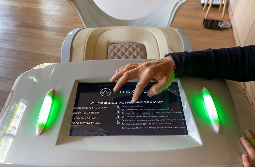 PODCALM combines therapeutic music, guided meditation, aromas, light, and vibrations for complete and instant relaxation, accessible anywhere and anytime.